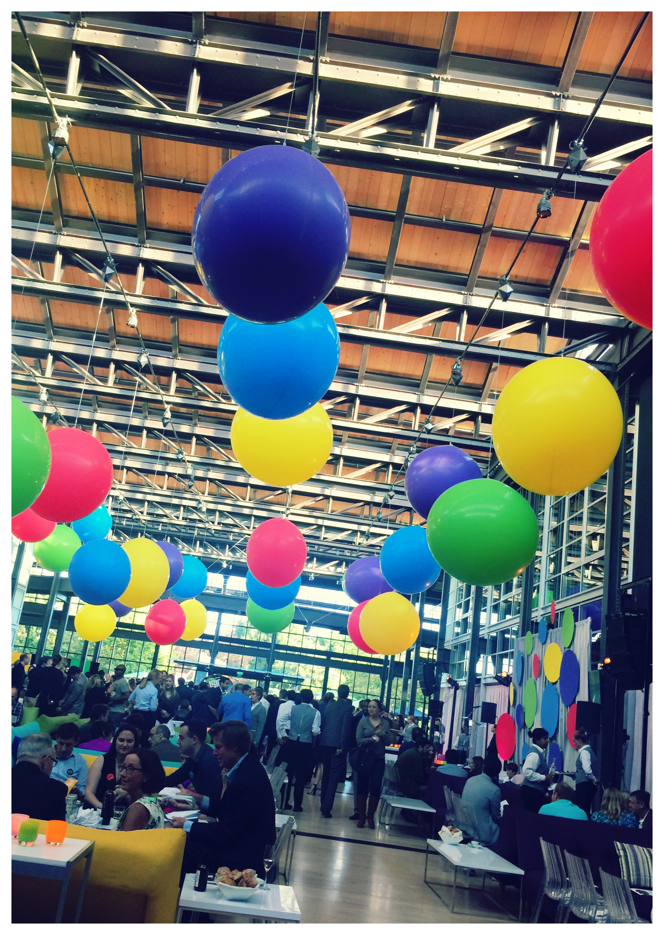 こちらはメインビルディングのカフェテリアのエリアに作られたディナー会場。カラフルでとても楽しいデザイン。