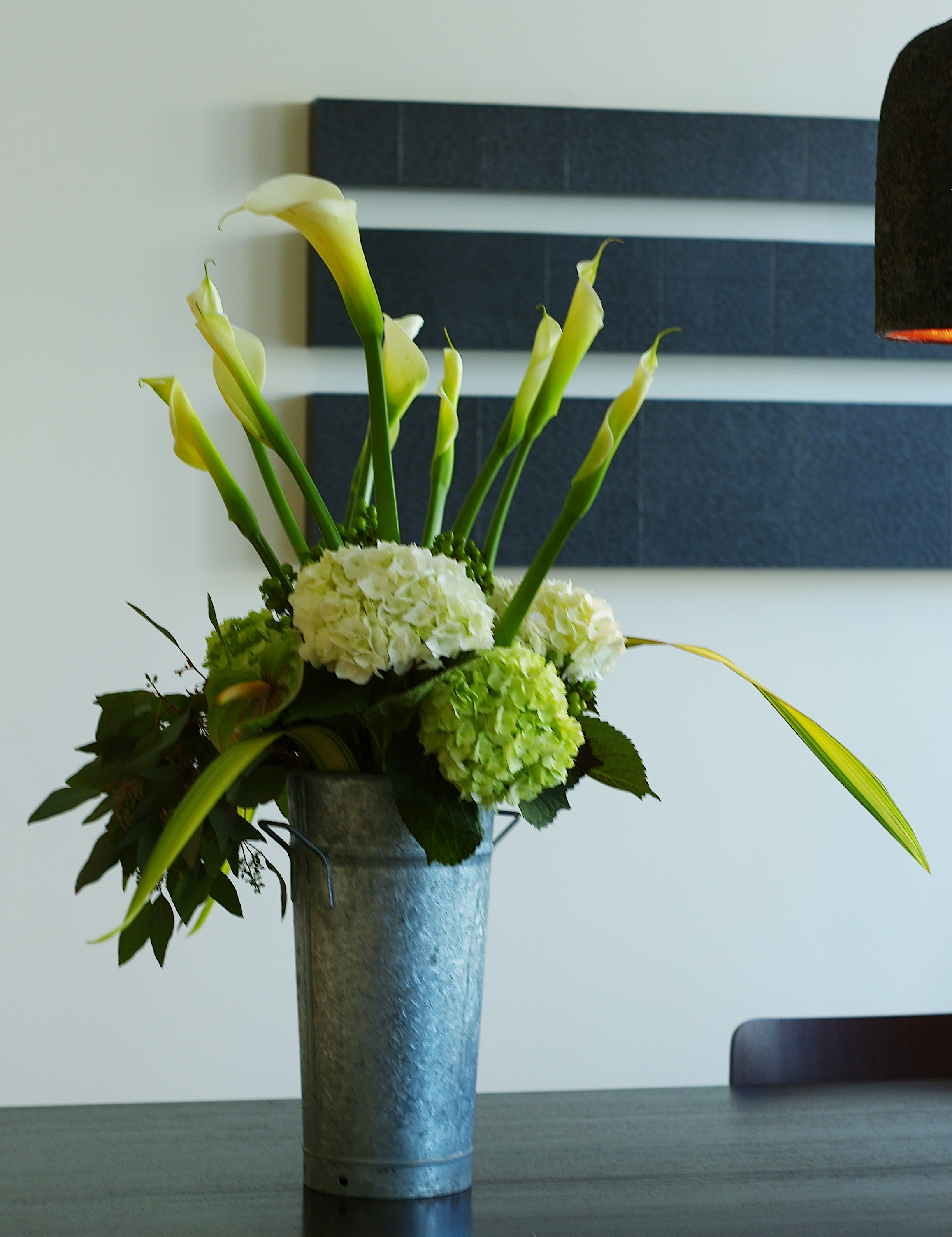 今回は、mom-to-beの仲良しにどんな花の色が好き??と聞いて、更に赤ちゃんが男の子という事もあり、あまりGirlyにならないように白とグリーンを貴重にアレンジメントを仕上げました♪ ちなみにお花は贔屓にしているお花屋さんに1週間ほど前にどんな花が欲しいかオーダーを入れ、前日にピックアップしてバスルームなどの冷暗所に置いておきます。そして当日に思うままにアレンジ。とっても喜んでくれたので嬉しかったです。
