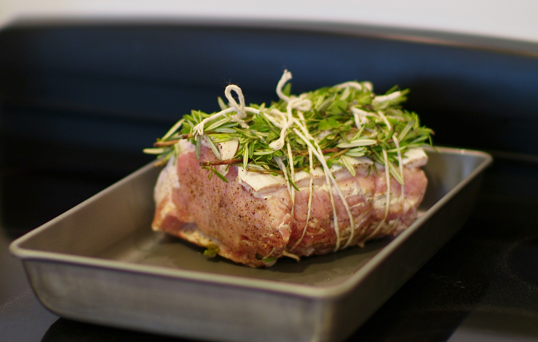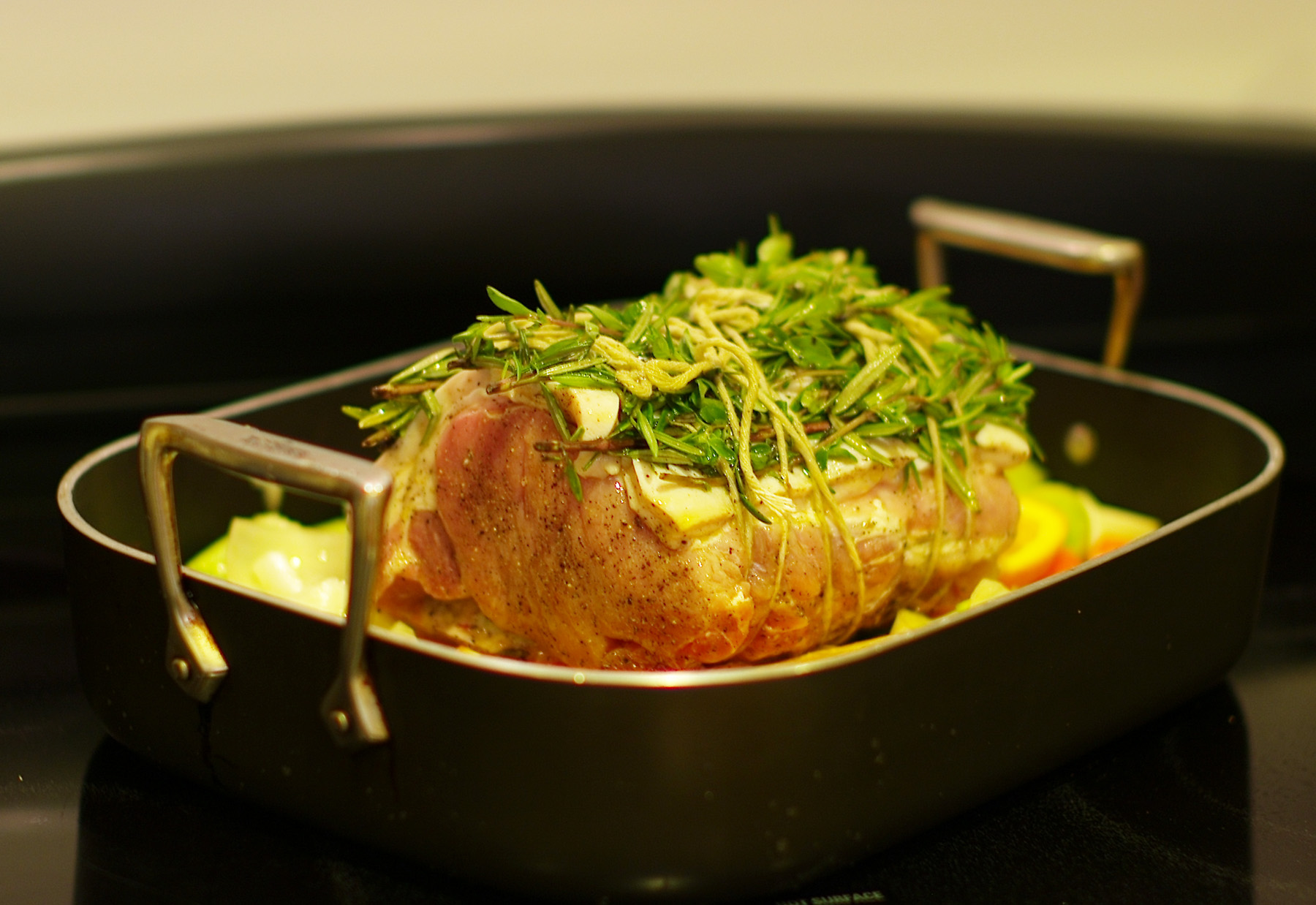 一晩塩水につけ、ローズマリーをふんだんに巻き付け、オリーブオイルと塩こしょう