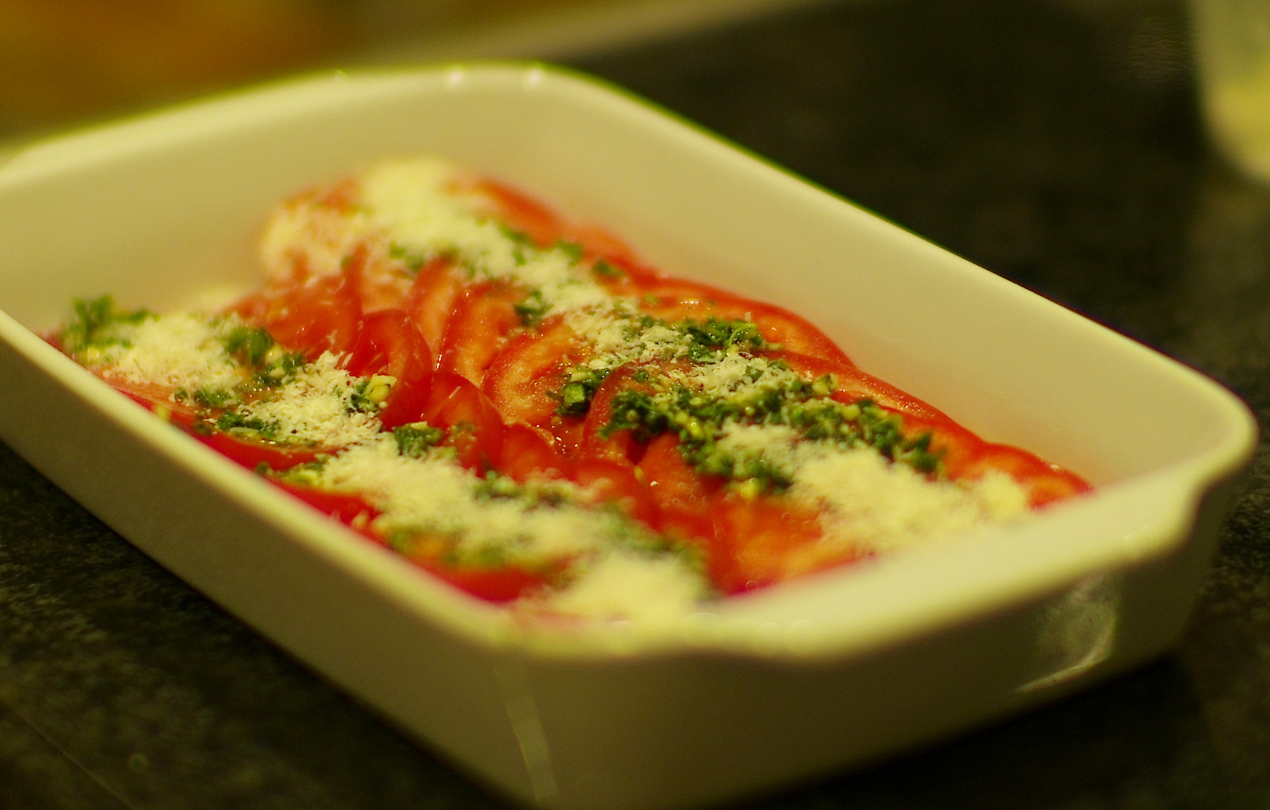 サイドには、トマトのスライスにニンニク、オレガノ、タイム、パルメジャンに塩こしょうをして、