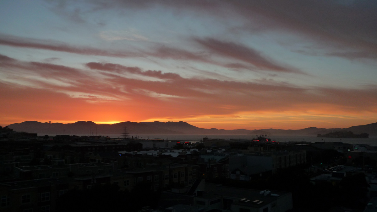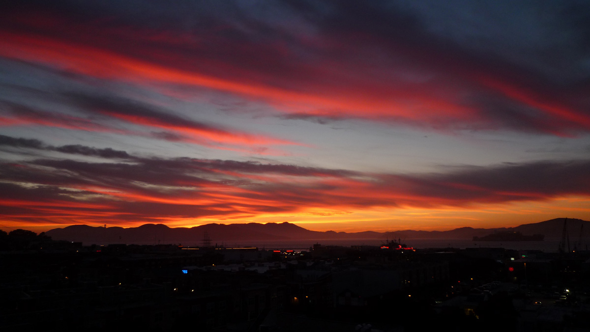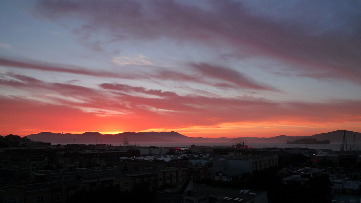 そして夕方サンフランシスコに帰って来て、夕飯を作っている時に外を見渡すと、こんな夕焼け