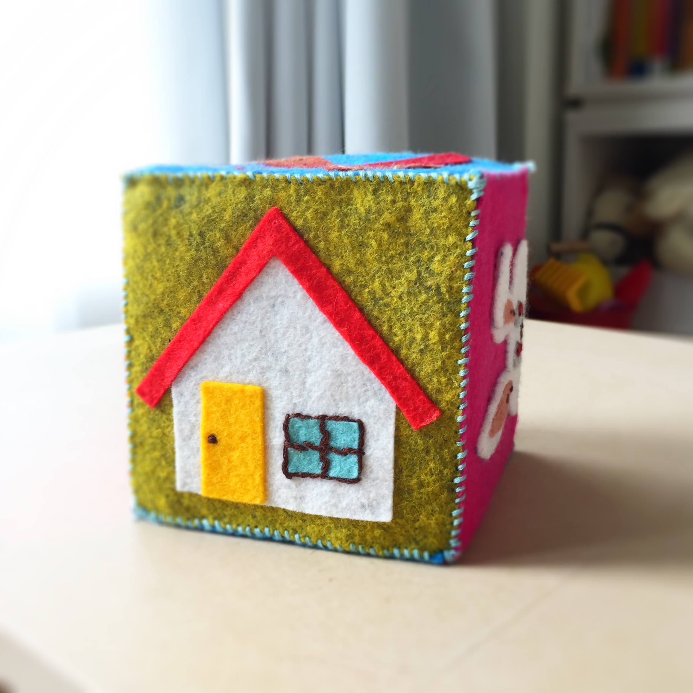 子供の頃の思い出になればと思って、積み立てブロックと言うのでしょうか? 中は柔らかいスポンジなようなもので外はフェルトを使っています。久しぶりに手作業で楽しいのですが、夜ちょっと元気がある時にチマチマやっているので、なかなか進みません。かれこれ3ヶ月ぐらいかかってようやく一つ目。といってもベースはできてデザインもできているので、あとは楽しいところばかり。
